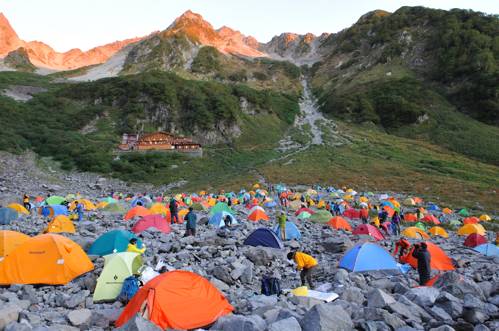 夜明けのテン場。夜露が凍ってました。