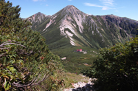 三俣山荘が見えました。後ろは鷲羽岳。美しい山です。